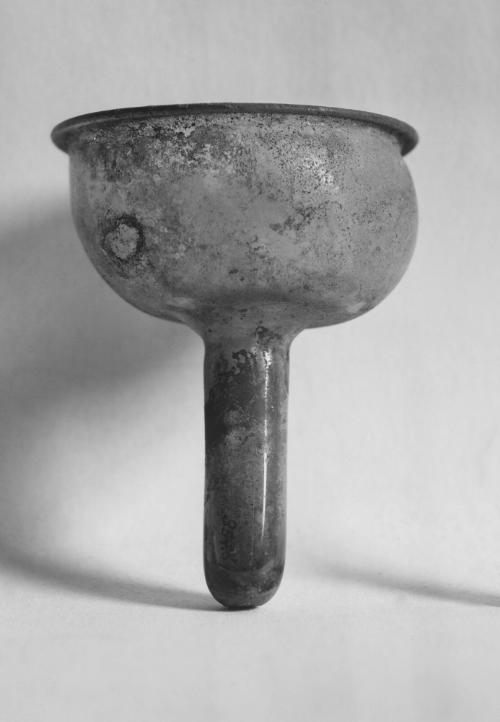 DescriptionThis delicate lamp is made of thin glass in a transparent yellow-green hue (between 5 GY 5/2 and 10 Y 5/4). It was shaped by free-blowing and tooling techniques. Small ovoid bubbles are visible in the body, while vertically elongated bubbles appear in the stem. The rim is everted and rounded in the flame, and it flares outward slightly. The bowl-shaped upper body has its greatest diameter just below the rim, with the walls curving strongly inward into a long, narrow cylindrical stem that ends in a rounded bottom. A pontil mark about 0.8 cm wide and tool marks at the junction of the stem and upper body can still be seen.