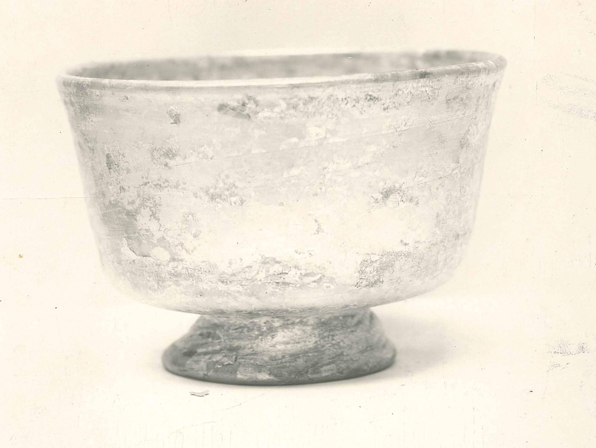 DescriptionThis pale green glass bowl, made in the 4th century CE, has straight sides that taper downward and meet the base at a rounded angle. The bottom slopes toward the ring-shaped base and shows marks from the tools used in its making. Small bubbles and spirals are visible in the thick glass.