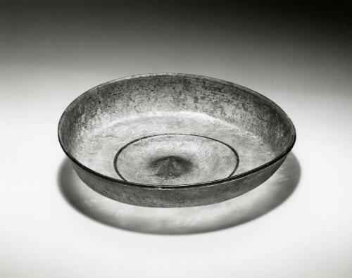 DescriptionFree-blown and tooled dish made from medium thin glass. The vessel is slightly asymmetrical, slumped to one side. It has a rounded, flame-thickened rim and straight, outward-sloping sides that meet the bottom in an obtuse angle. The bottom slopes toward a thickened center, forming a slightly concave base with a pushed-in hollow tubular base ring. A circular wad is present at the center of the base, approximately 1.4 cm in diameter. The glass is transparent natural pale green (10 G 6/2), though surface weathering obscures the fabric.