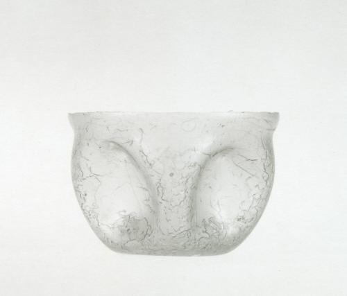DescriptionThis indented cup is free-blown and tooled from very thin, transparent natural pale green glass (10 G 6/2). The fabric cannot be determined due to weathering. The rim is everted, with convex sides and an unworked edge bent outward from a slight constriction. The squat, bulbous body reaches its greatest diameter at the middle and rests on a slightly concave base. Four large circular indentations are tooled into the body, each marked at the center by a reamer impression. No pontil mark is visible.