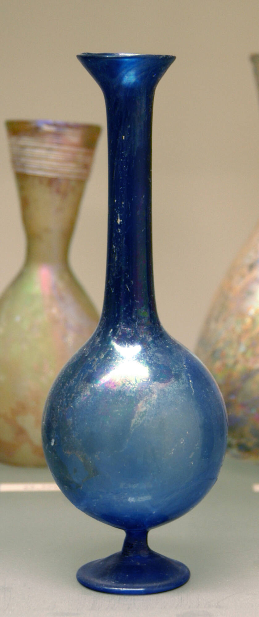 DescriptionThin glass bottle classified as Bottle II A 2 h. The glass is transparent dark blue with a few small bubbles and black specks. The rim is rounded in flame, forming a flaring mouth. The tubular neck curves into a shoulder that slopes to an ovoid body tapering downward. The base is pushed in with a hollow tubular base ring that forms a hollow stem. There is no pontil mark.
