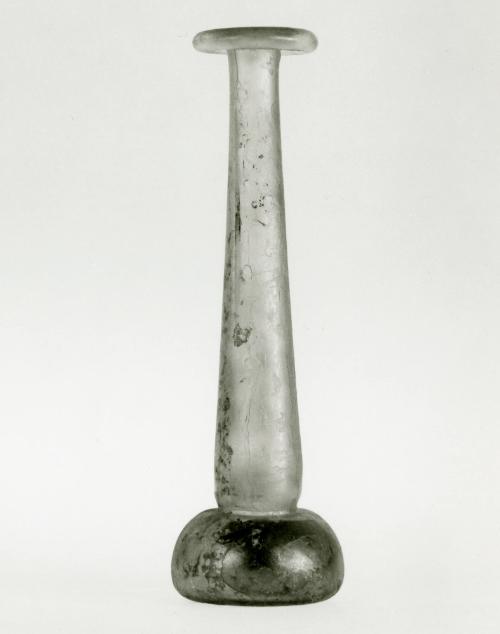 DescriptionThe bottle has a wide, flat rim and a long, narrowing neck that meets a short, rounded body. It was shaped by hand from pale green glass without being attached to a metal rod, a technique known as free-blowing. Tiny air bubbles trapped during the making process are still visible in the glass.