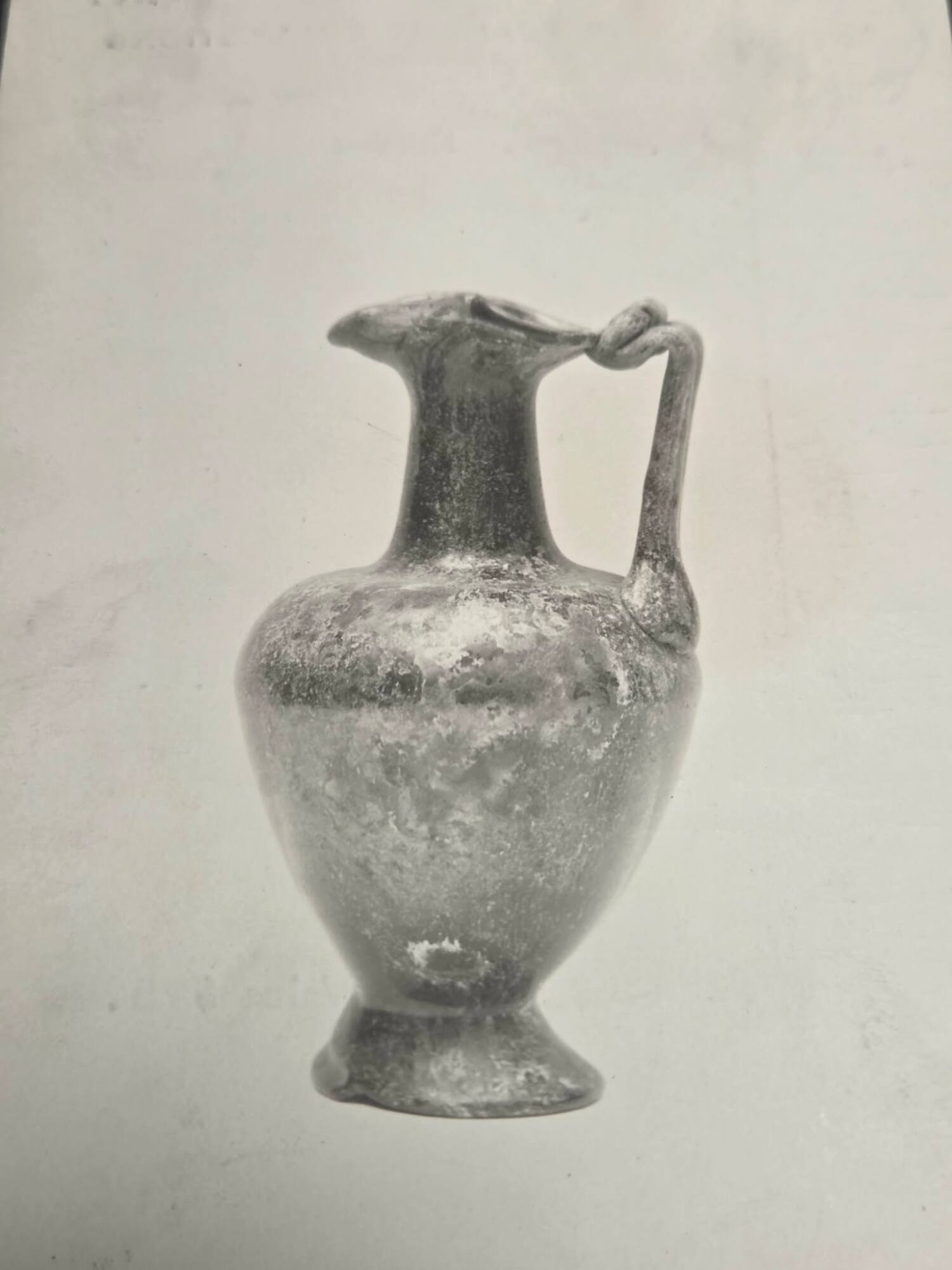 DescriptionThis bulbous jug with a spouted mouth and base ring is free-blown and tooled from medium thin translucent to transparent streaky manganese-colored dusky red glass (near 5 R 3/4), with a translucent pale olive ribbon handle (near 10 Y 6/2). The glass contains numerous pinprick bubbles, many of which have burst at the surface, along with black specks and a large sandy impurity in the handle. The jug was formed free-blown with a pontil mark approximately 2.5 cm in diameter, and excess glass at the tip of the handle was folded back into the loop at the rim. The rim is folded outward, upward, and inward to shape the spouted mouth, leading to a cylindrical neck with a slight taper and a curved transition to a nearly horizontal shoulder. The bulbous body has its greatest diameter at the shoulder and slightly convex walls that taper to a small applied base ring with outsplayed sides, which is unevenly trimmed. A straight strap handle with two broad ribs, semicircular in section, is applied to the shoulder and attached to the side of the rim where it projects above the top of the rim and is pressed down to form a closed loop against the side of the mouth. This vessel is classified as Jug Class IB3b with strap handle IIB2a.