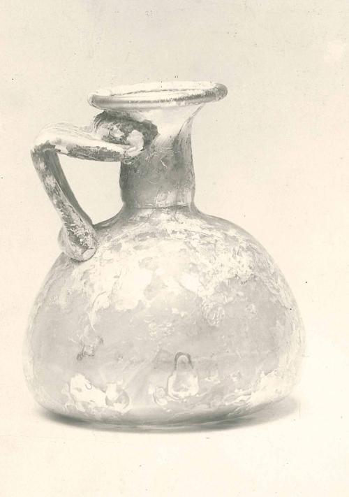 DescriptionThis Roman jug is made of pale green glass. It has a short, rounded body, a flaring rim, and a wide handle connecting the neck to the shoulder. The vessel was shaped by hand, and the marks left by the glassblower can still be seen where the handle was attached.