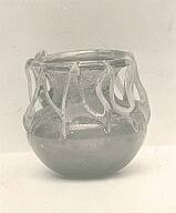 DescriptionThis vessel is made of medium-thin glass in a transparent manganese-colored slightly streaky grayish red (near 10 R 4/2), with a translucent natural grayish yellow-green zigzag coil (between 5 GY 7/2 and 5 GY 5/2). The body contains a few pinprick bubbles. The jar was free-blown and tooled, with applied decoration. A pontil mark about 1.3 cm in diameter is visible, and the excess glass at the end of the zigzag was drawn out thin and snapped off.