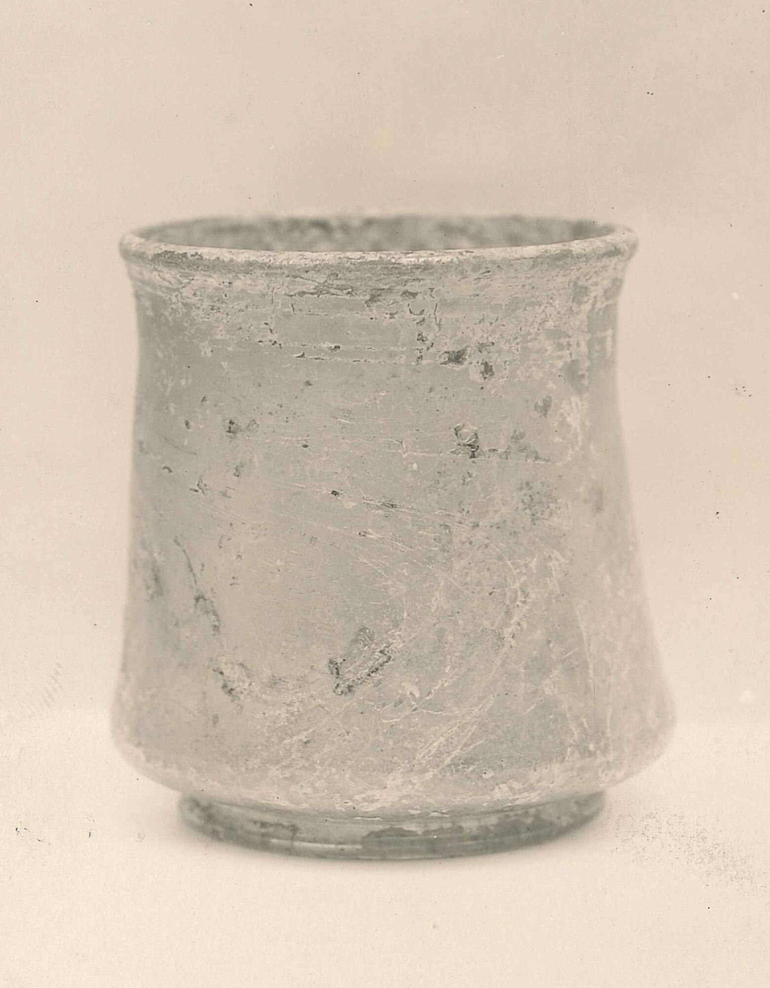 DescriptionThis transparent dusky yellow-green beaker (5 GY 5/2) was formed using free-blown and tooled techniques, with a pontil mark approximately 1.1 cm in diameter. The medium-thin glass shows concentrations of bubbles, ranging from pinprick to long diagonals aligned with the blowing spirals. The vessel has a flaring, rounded rim thickened in the flame, and concave sides that broaden toward a sharply carinated shoulder just above the base. The base is concave with a narrow, curved, hollow tubular ring.
