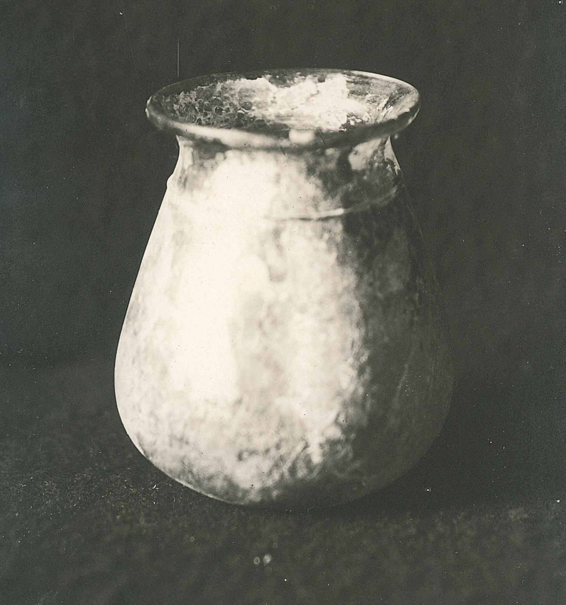 The vessel features an outsplayed rim that is rounded and thickened in the flame, with a visible tooling mark along the interior edge. The body swells to its greatest diameter just above the base and narrows into a slightly flattened bottom with a central depression.