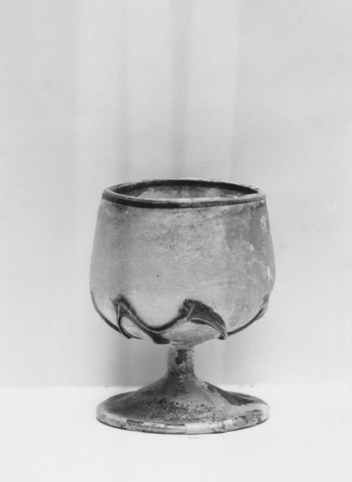 DescriptionMedium thick glass with numerous pinprick bubbles and blowing spirals. Transparent pale green (near 5 G 7/2). Translucent dark blue threads. Free-blown. Pontil mark about 1.3 cm. Added thread. Rim topped with thread and rounded in flame. U-shaped body with convex sides and a short hollow tubular stem. High pushed-in base with hollow tubular base ring; the center of the base is pushed up through the stem into the bottom of the cup, forming a small concave bulb. A thick thread runs along the top of the rim. Thread applied in a seven-section zigzag on the lower half of the body.