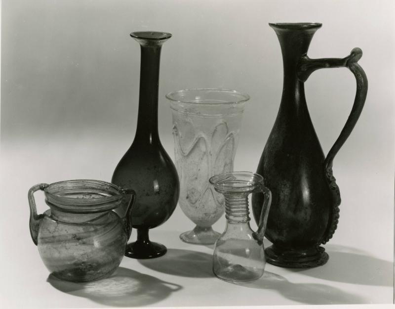 DescriptionThis Roman beaker, made from medium thin, clear pale green-tinted (10 G 6/2) glass, was free-blown and tooled. Small pinprick and elongated bubbles are visible throughout the body, with horizontal bubbles near the rim. The rim is everted, rounded, and thickened in the flame. The tall, U-shaped body tapers to a point and sits on a separately blown base with flaring sides and a flame-rounded edge. A pontil mark approximately 1.4 cm in diameter is present on the base. Below the rim, two overlapping revolutions of applied thread encircle the neck for about 4 cm. On the body, two zigzag coils of glass create seven large ovals, visible as convex bulges on the interior surface.