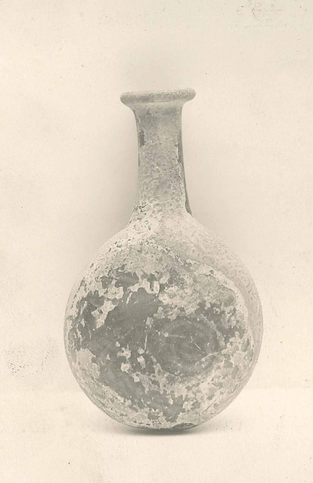 DescriptionThis olive-brown glass bottle was made in the 3rd–4th century CE. It has a tall neck, rounded flattened body, and many small bubbles in the glass. The vessel does not stand upright.