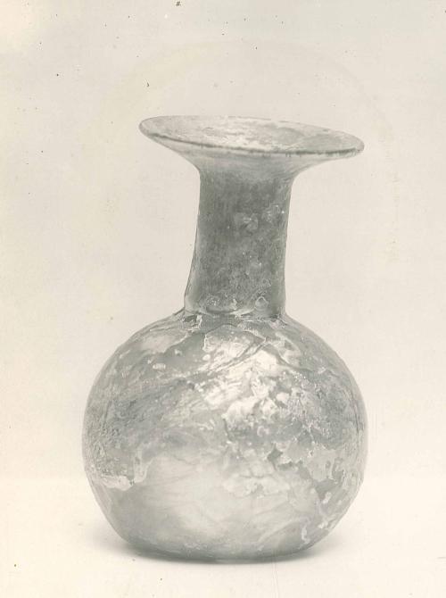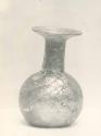 Rim outsplayed at an angle and rounded in flame. Tall tubular neck with constriction at its base where interior cut-out forms a diaphragm with an aperture of ca. 1.0 cm. Bulbous body with greatest diameter just below middle. Concave base.
