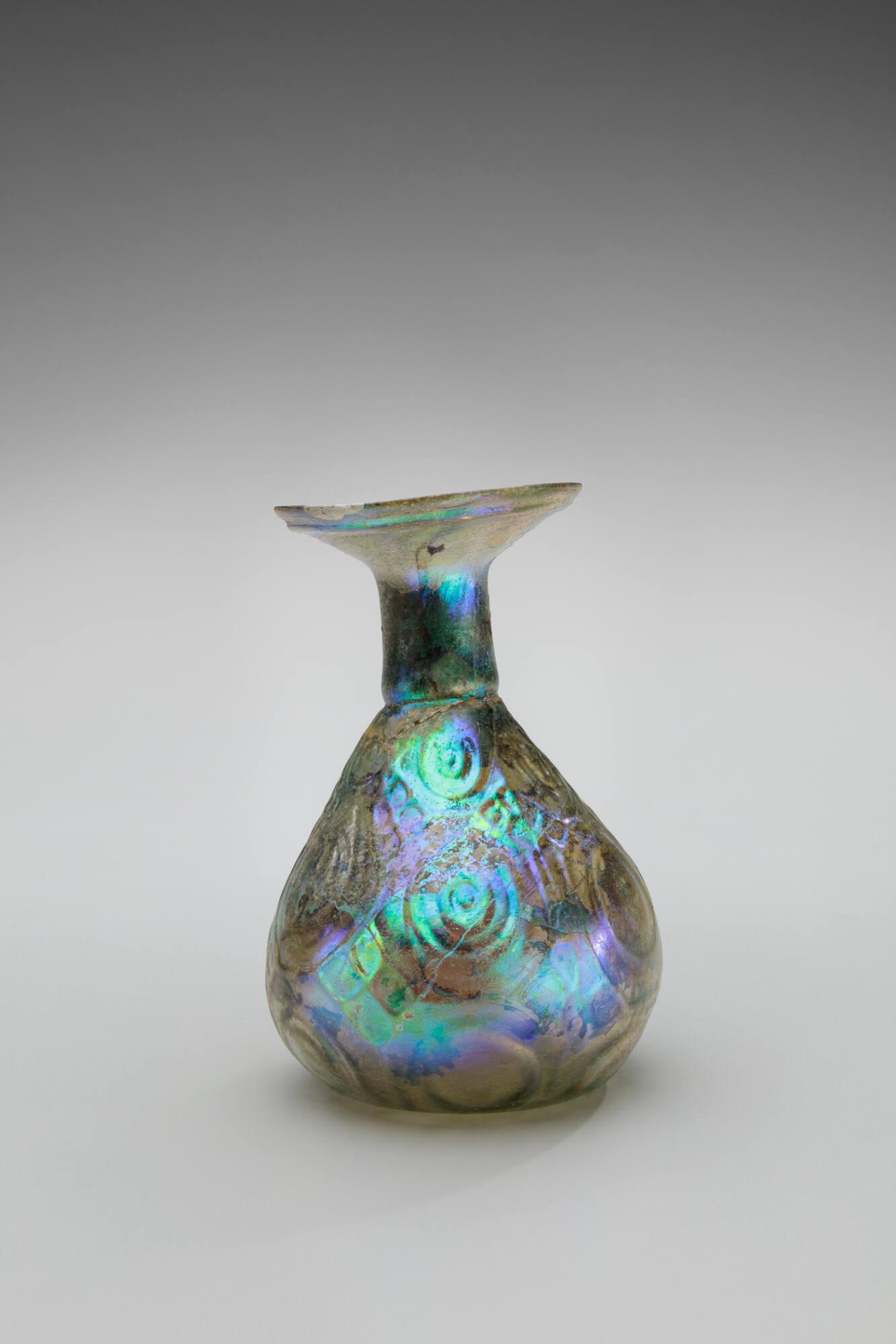 Label TextThis pear-shaped flask was designed to dispense precious oils or perfumes one drop at a time. A small internal restriction, or diaphragm, at the base of the neck controls the flow of liquid, giving the vessel its modern name: a "sprinkler." The intricate pattern of concentric circles and hexagons was created by blowing the hot glass into a reusable two-part mold. Although the dealer who sold this piece in 1953 claimed it was from the famous 1st-century workshops of Sidon, scholars now identify this type of geometric mold-blown glass as a product of Syrian workshops from the Late Roman period, several centuries later.Comparative ReferencesCf. Stern, E. M., Ancient Glass at the Fondation Custodia (Collection Ernesto Wolf), Groningen, Wolters-Noordhoff, 1977. (Cited as parallel in file). Cf. von Saldern, Axel, Gläser der Antike: Sammlung Erwin Oppenländer, Hamburg, Museum für Kunst und Gewerbe, 1974, p. 177, no. 489. (Cited as parallel in file).3rd-4th century CE