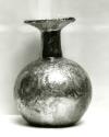 Rim outsplayed at a 45 degree angle, rounded and thickened in flame with tool mark along edge on interior. Tall slightly tapering tubular neck with constriction at its base where an interior cutout forms a diaphragm with an aperture of 2.0 cm. Spherical body. Concave base.