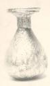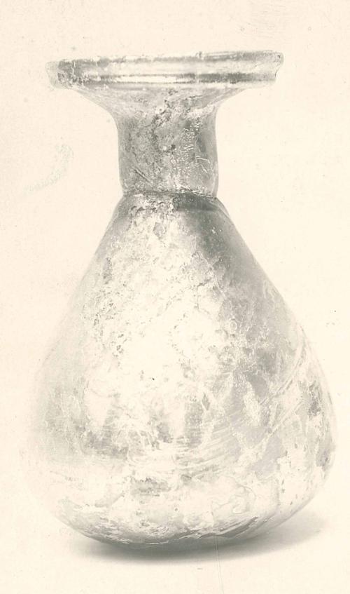 Rim outsplayed at a 45 degree angle and rounded in flame with a projecting roll below. Tubular neck with constriction at its base where an interior cut-out forms a diaphragm with an aperture of ca. 0.5 cm. Piriform body. Flattened base with slight depression in center.