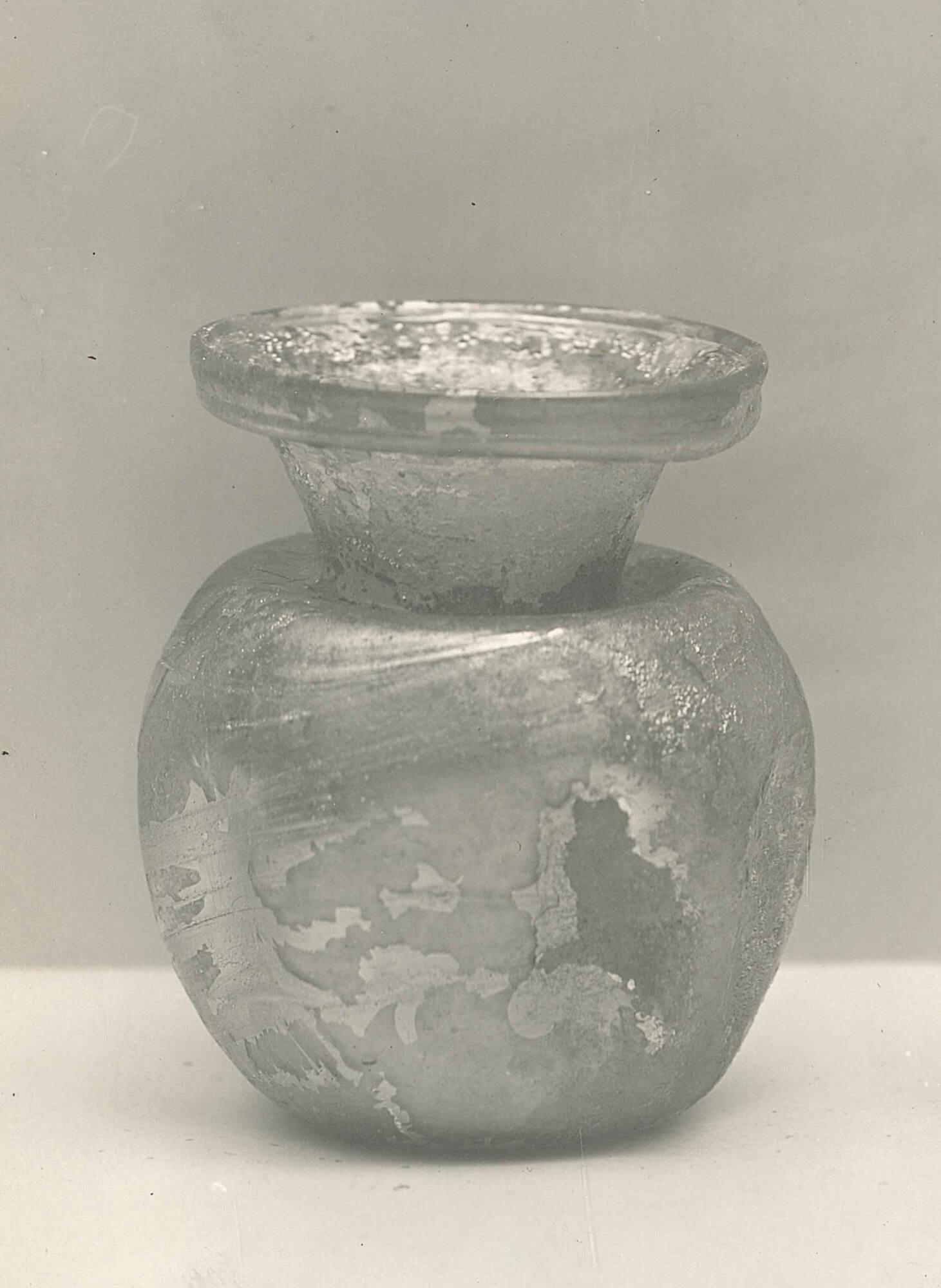 DescriptionThis vessel is classified as Jar Class IA2. It is made of medium thick, free-blown and tooled glass. The glass is transparent with a natural pale green tint (near 10 G 6/2) and shows visible blowing spirals and small bubbles. The pontil mark cannot be distinguished due to weathering.