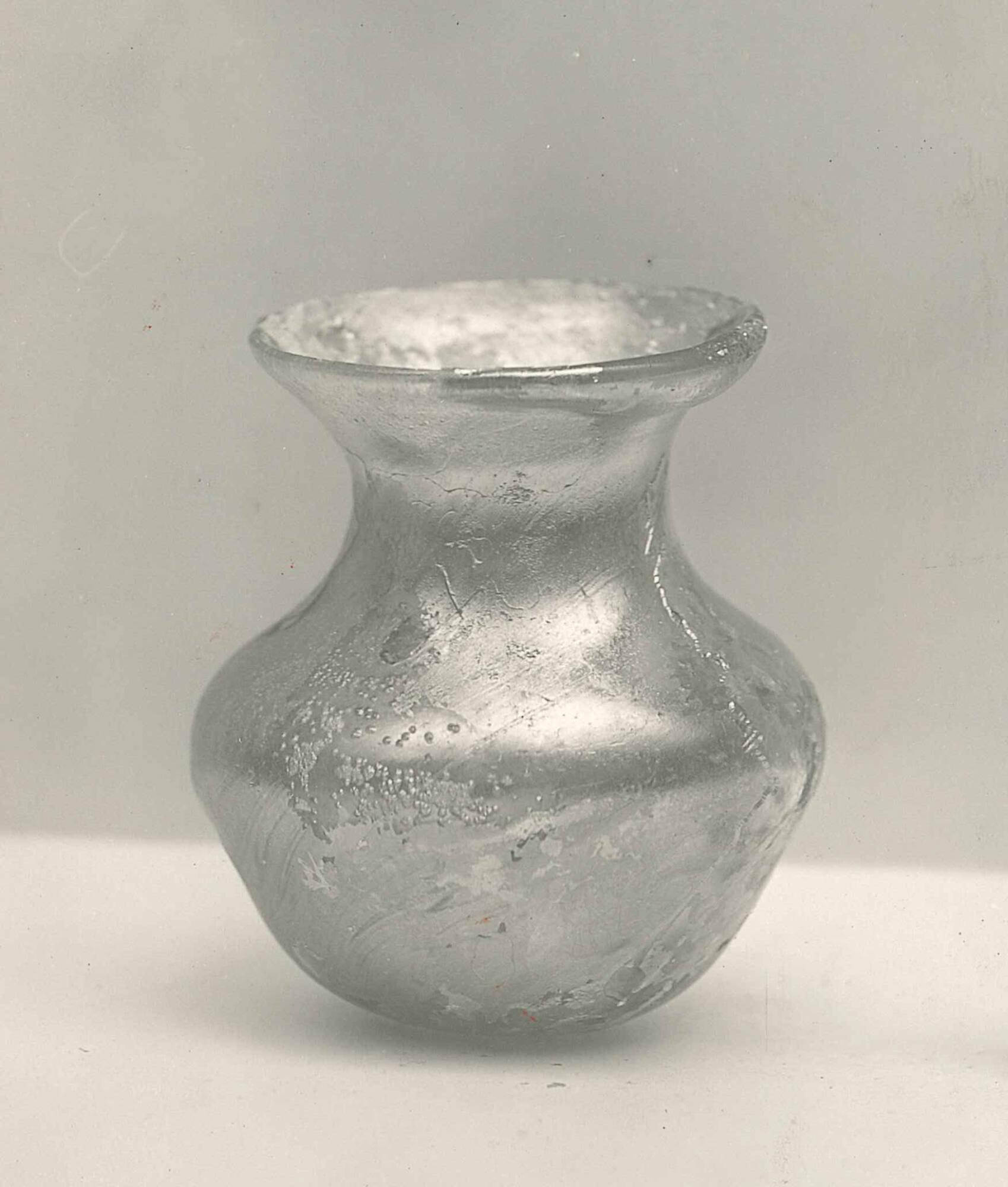DescriptionThe jar is free-blown and tooled. It is made of thin glass with visible blowing spirals. The exact fabric cannot be determined because of weathering. It has a transparent natural green tint, though the exact color cannot be determined because of weathering. The rim is rounded in the flame. The tall concave neck has an interrupted curve and a curved transition to the shoulder. The shoulder is strongly sloped. The bulbous body has its greatest diameter at the shoulder. The base is flattened with a slight depression in the center. A pontil mark, approximately 1.0 cm wide, is present. The vessel belongs to Jar Class IA3a.