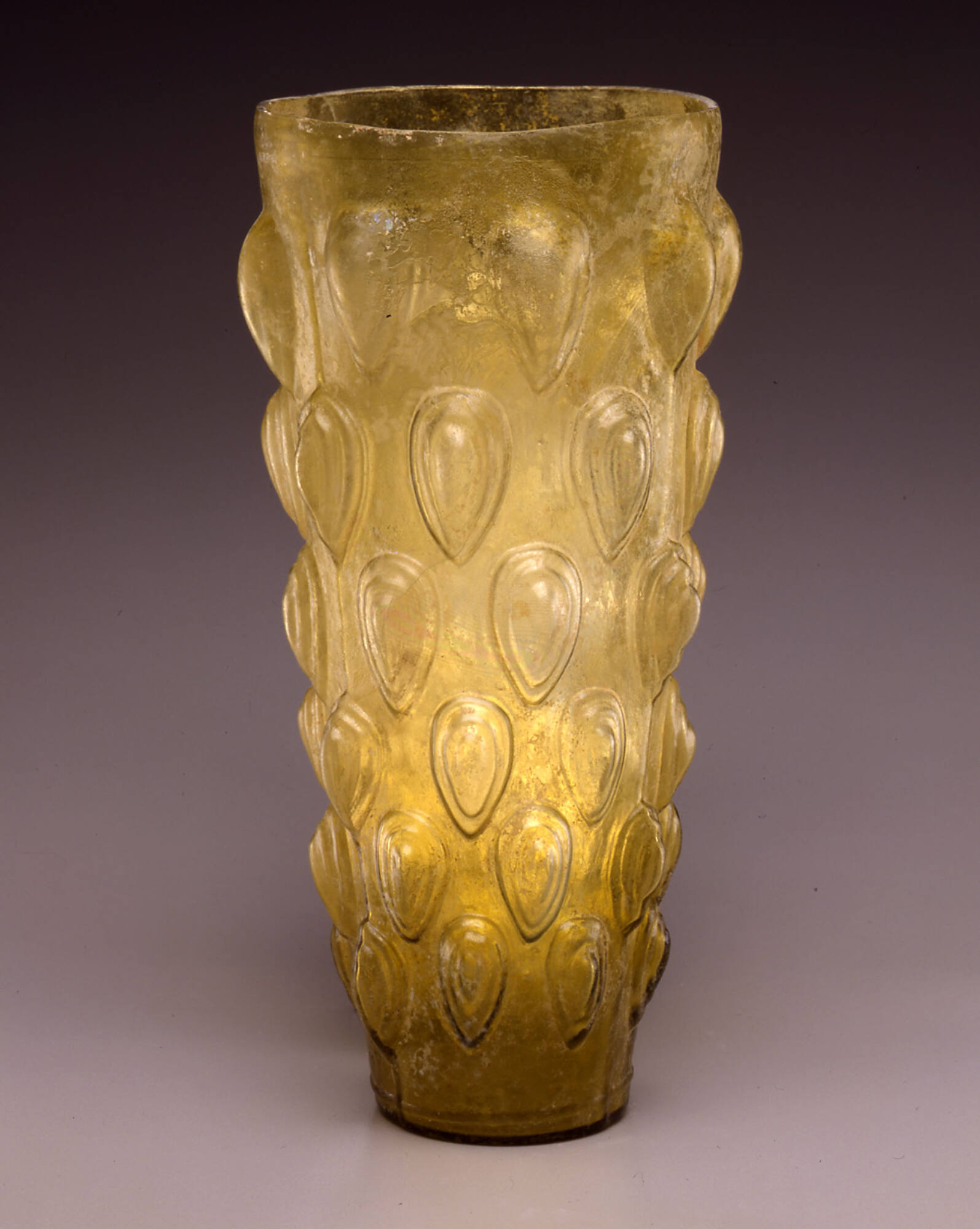 DescriptionThis large beaker is made of transparent to translucent dusky yellow glass (near 5 Y 6/4) with medium thin walls. The vessel was blown into a four-part mold with three vertical sections and a disk-shaped base section (MCT III), producing crisp relief decoration. The rim is slightly ground and flares gently with a subtle bulge below. The truncated conical body tapers toward a flat base with two raised concentric rings and a central boss. A faint wheel-cut line circles the exterior approximately 0.9 cm below the rim.