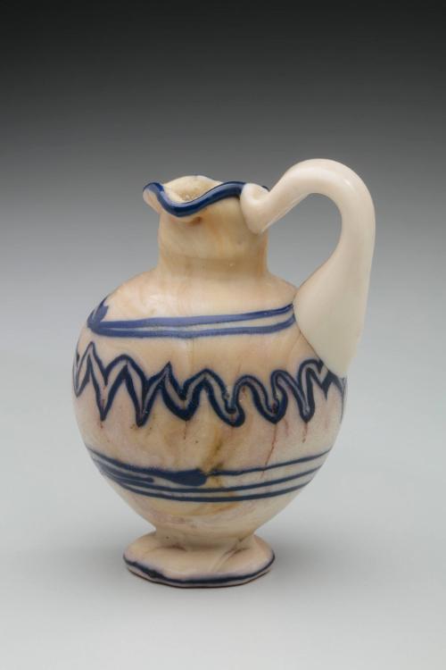 DescriptionOinochoe. Opaque white ground with opaque medium blue decoration. Outsplayed trefoil rim, with rounded edge; short cylindrical neck; ovoid body; convex bottom; outsplayed pad-base with rounded edge. An opaque white strap handle extends from the shoulder to the edge of the rim, rising vertically above the rim. A partly marvered opaque medium blue thread attached to the edge of the rim; another opaque medium blue thread, marvered, wound horizontally twice around the shoulder; another opaque medium blue thread begun at the middle of the body and tooled into two rows of irregular zigzags; below this, another opaque medium blue thread begun on the lower body and wound horizontally three times; finally, a marvered opaque medium blue thread attached at the edge of the pad-base.