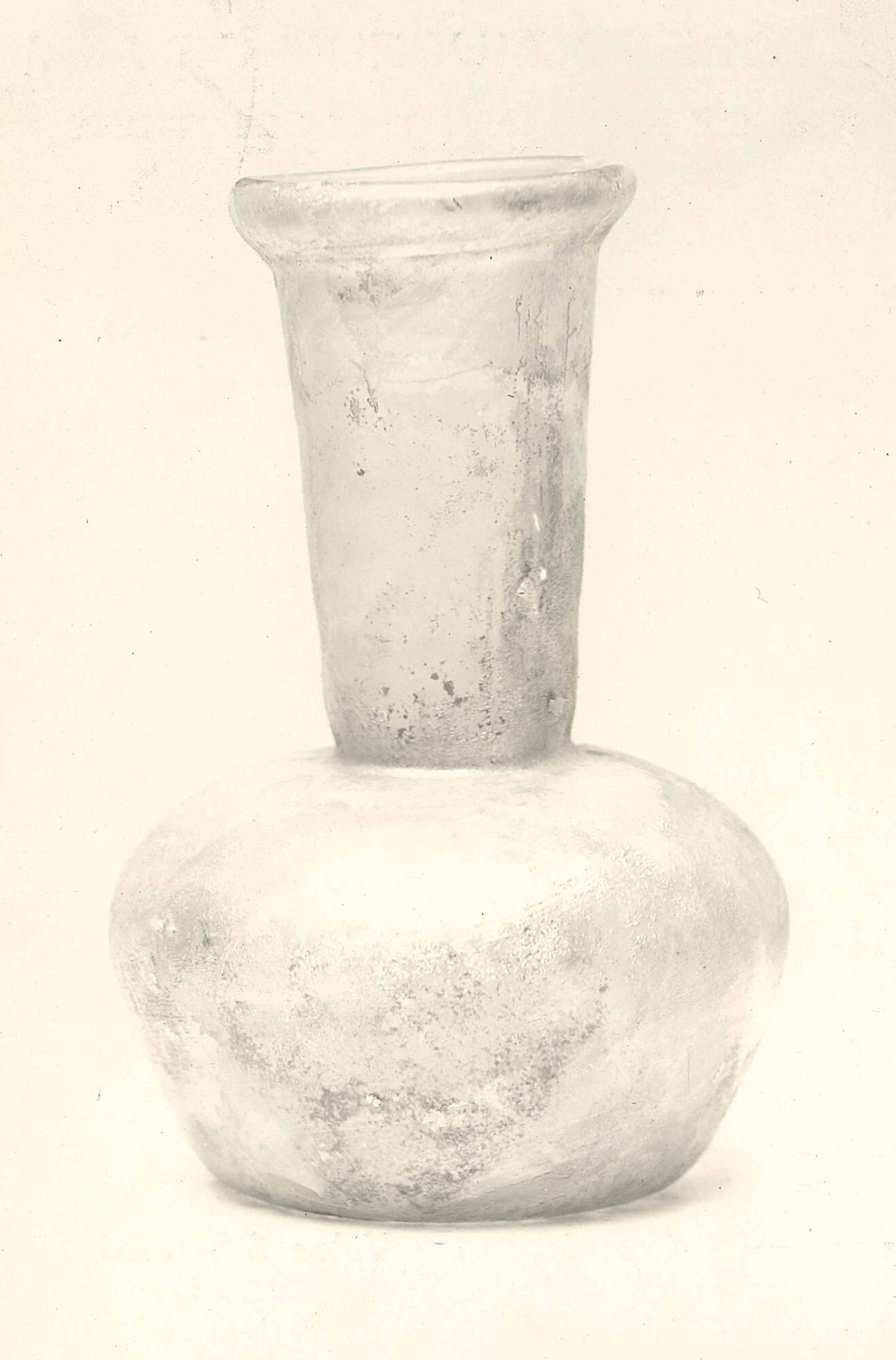 DescriptionThis green glass bottle, made between the 4th and 5th centuries CE, has a squat bulbous body, a tall funnel neck with a slight bulge, and a tubular rim folded in several directions. The base is concave with its widest point at the center. The bottle was shaped by blowing and tooling.