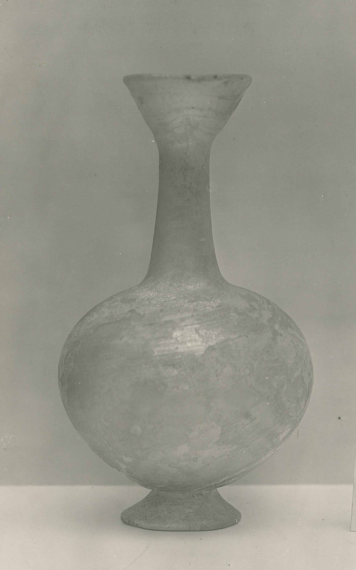DescriptionThis pale green glass bottle was made around the 4th century CE. It has a tall neck with a small funnel-shaped mouth, a rounded body that narrows at the base, and a ring-shaped foot. Marks on the glass show how it was shaped by hand.