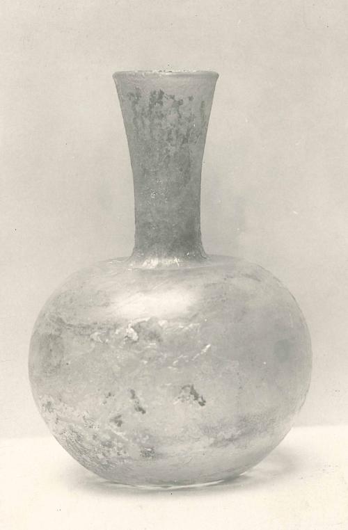 DescriptionThis blue-green glass bottle, made in the 3rd–4th century CE, has a spherical body, a tall funnel-shaped neck, and a rounded rim. The base is flat with a small central depression. The piece was shaped by blowing.