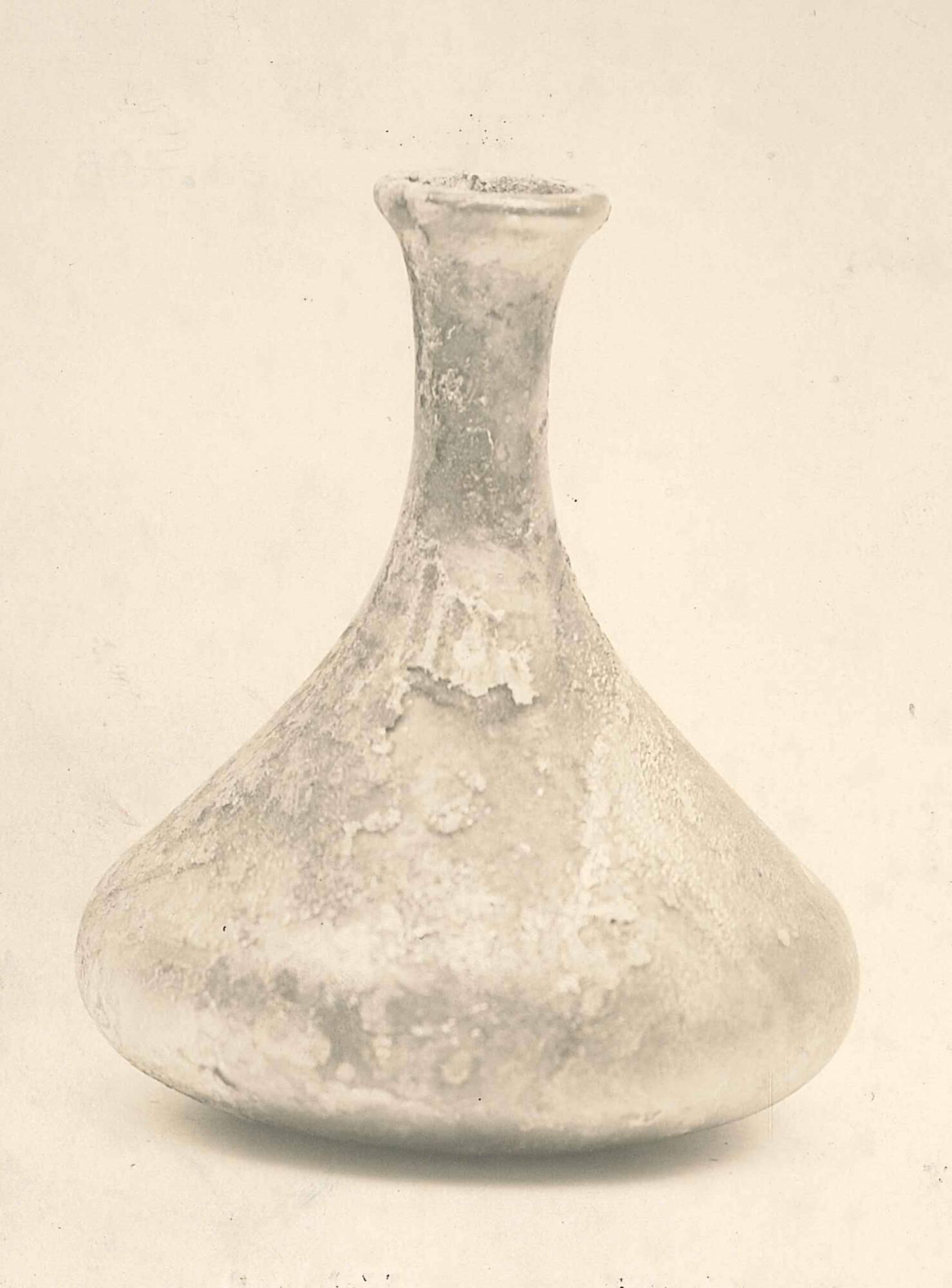 DescriptionThis piriform (pear-shaped) bottle is made from transparent natural grayish green (near 5 G 5/2) glass. The vessel was free-blown and features a pontil mark approximately 1.4 cm across. The glass is of medium thinness, although its fabric cannot be evaluated due to weathering.