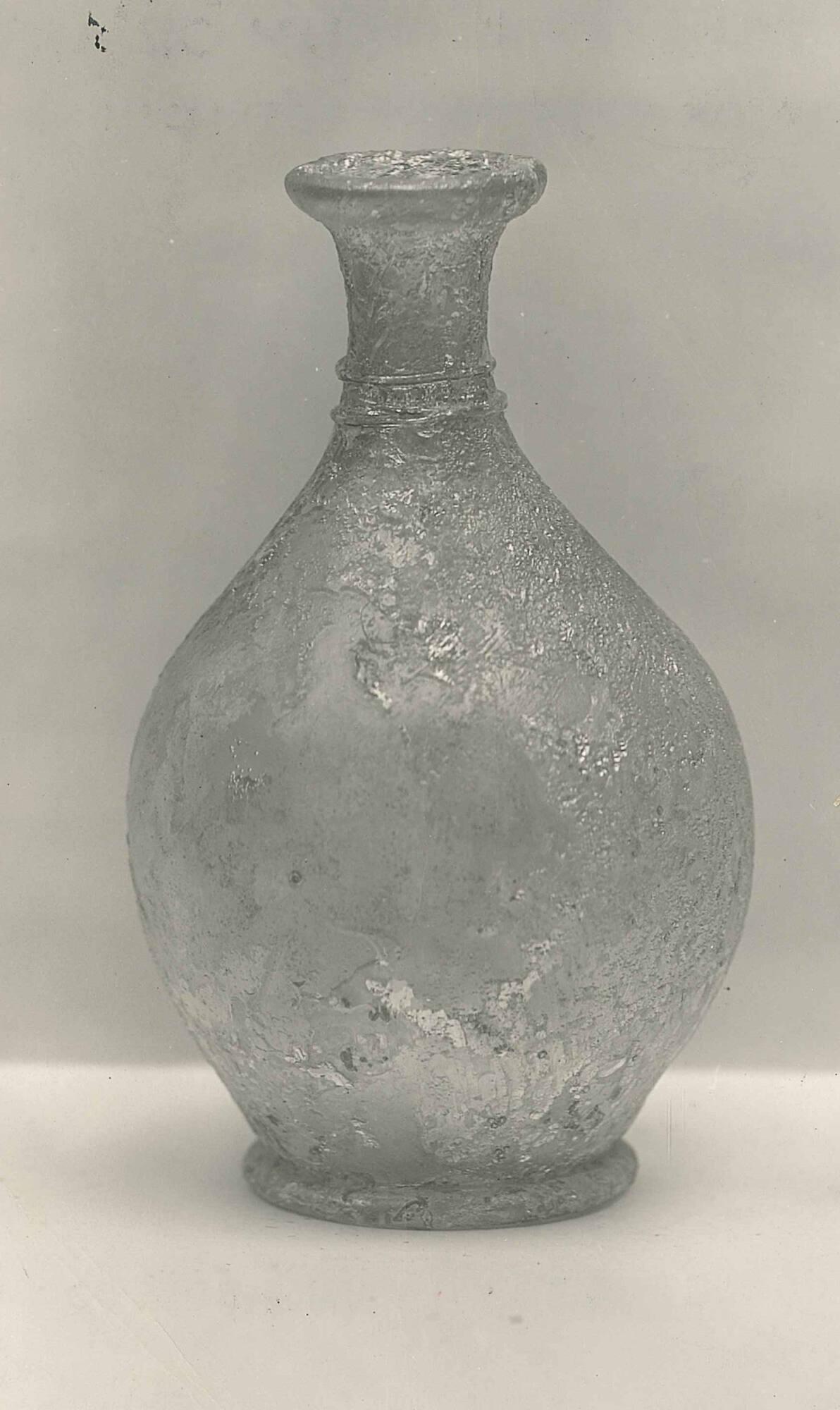 DescriptionClassified as Bottle II D 3 b, this vessel is free-blown and tooled from medium thin, transparent natural grayish green glass (5 G 5/2), with a similarly colored applied thread. The fabric cannot be determined due to weathering. The rim is folded outward, upward, inward, and downward. The concave neck transitions smoothly into a strongly sloped shoulder and ovoid body, which reaches its greatest diameter at the midpoint. The flat base features a central depression and a hollow, tubular pushed-in base ring. Two revolutions of thread are applied at the base of the neck. The pontil mark cannot be detected due to weathering.