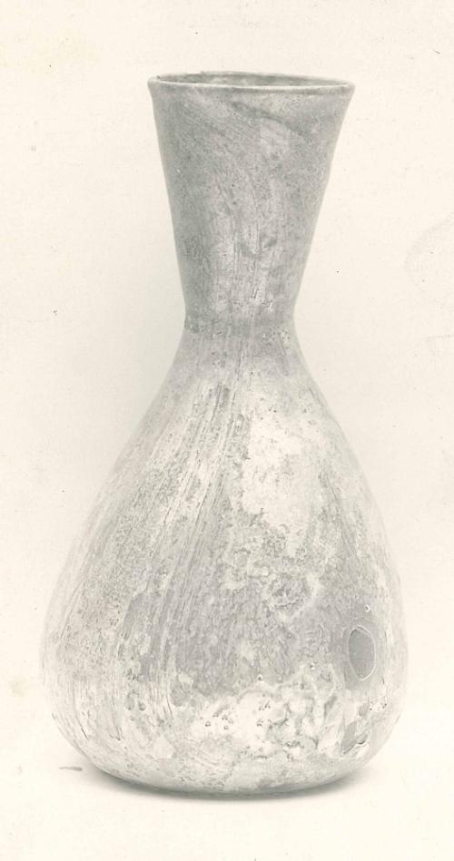 DescriptionThis green glass bottle, made in the early to mid-4th century CE, has a pear-shaped body, a funnel neck with a slight bulge, and a flat base with a central depression. The surface shows spirals from the blowing process. The piece was shaped by blowing and tooling.