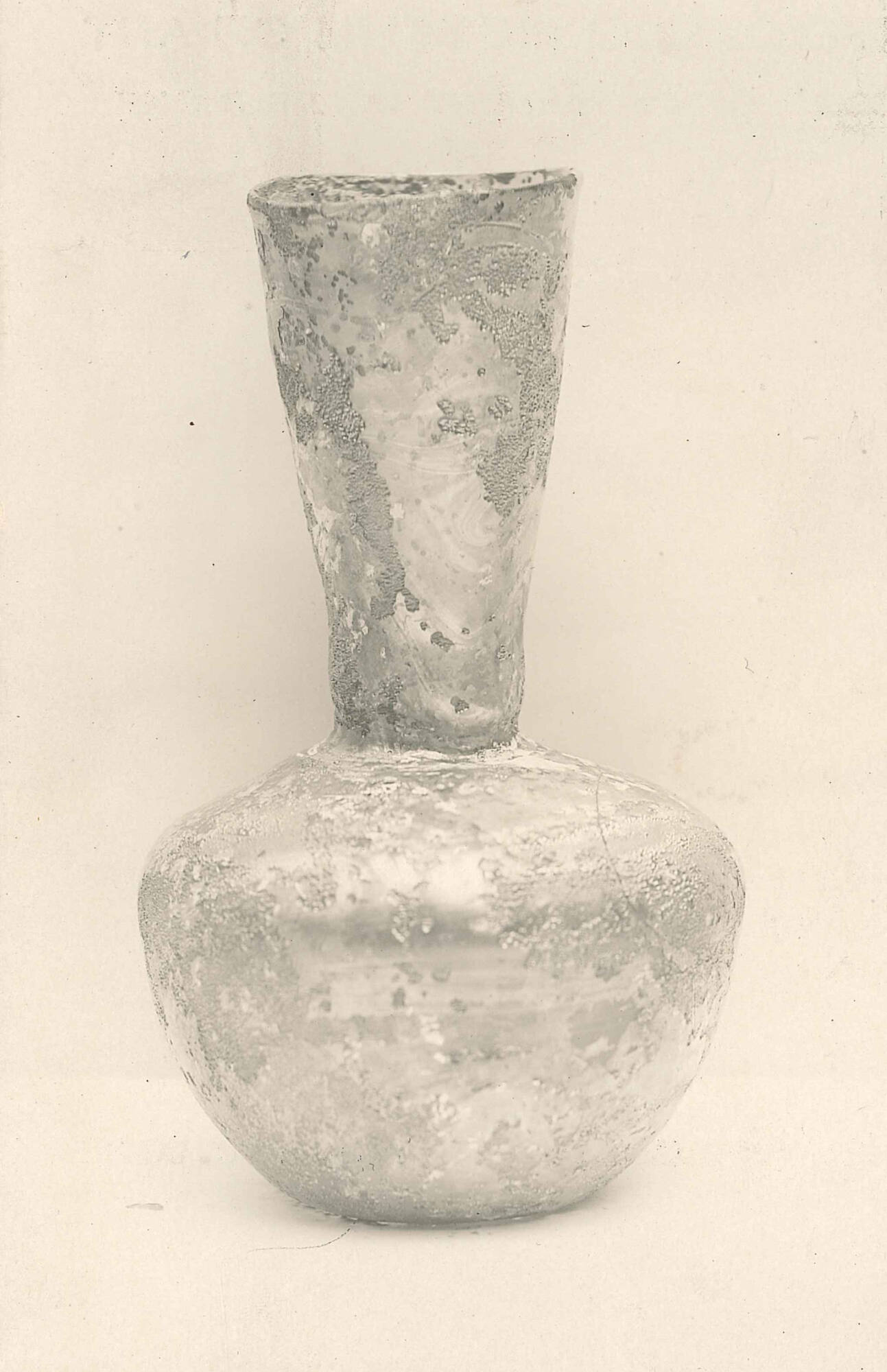 DescriptionThis small glass bottle was made during the 4th or 5th century CE. It was shaped by blowing air into molten glass—a method known as free-blowing—without using a mold. The bottle’s rounded rim was finished in a flame, and it has a funnel-shaped neck, sloping shoulders, and a round body that is widest just above the middle