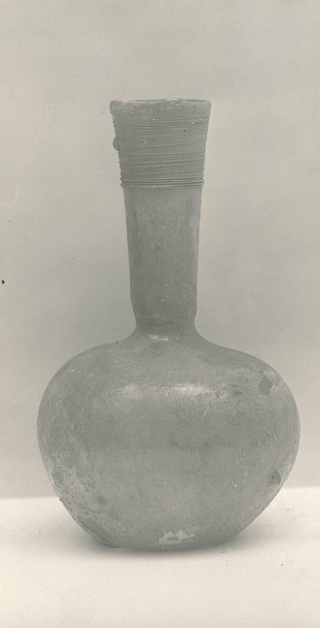 DescriptionThis bottle (Bottle I C 1 a) is made of thin, transparent natural green glass. Its exact color is obscured due to weathering. The vessel was shaped by free-blowing and tooling, with no pontil mark. The rim is rounded in a flame, with a tool mark along half of the interior. The neck is funnel-shaped with a slight bulge above a basal constriction. It has a gently sloping shoulder and a bulbous body with its widest point just above the middle. The base is concave. The neck features 15 revolutions of trailed thread, moving from right to left, starting halfway down and looping up and down in at least three segments. Four small, irregularly shaped chips appear in a row below the midpoint of the body.