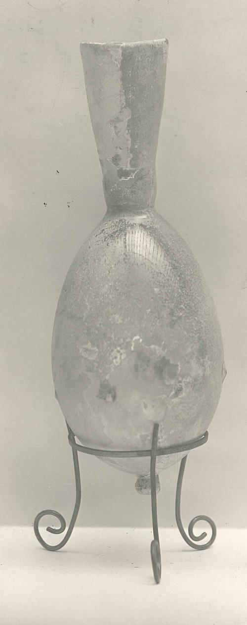 DescriptionThis pale green glass bottle, made between the 3rd and 5th centuries CE, has an ovoid body decorated with a row of small blue-green blobs. The base has an applied knob, so the vessel cannot stand upright. The piece was shaped by blowing, with added decoration.
