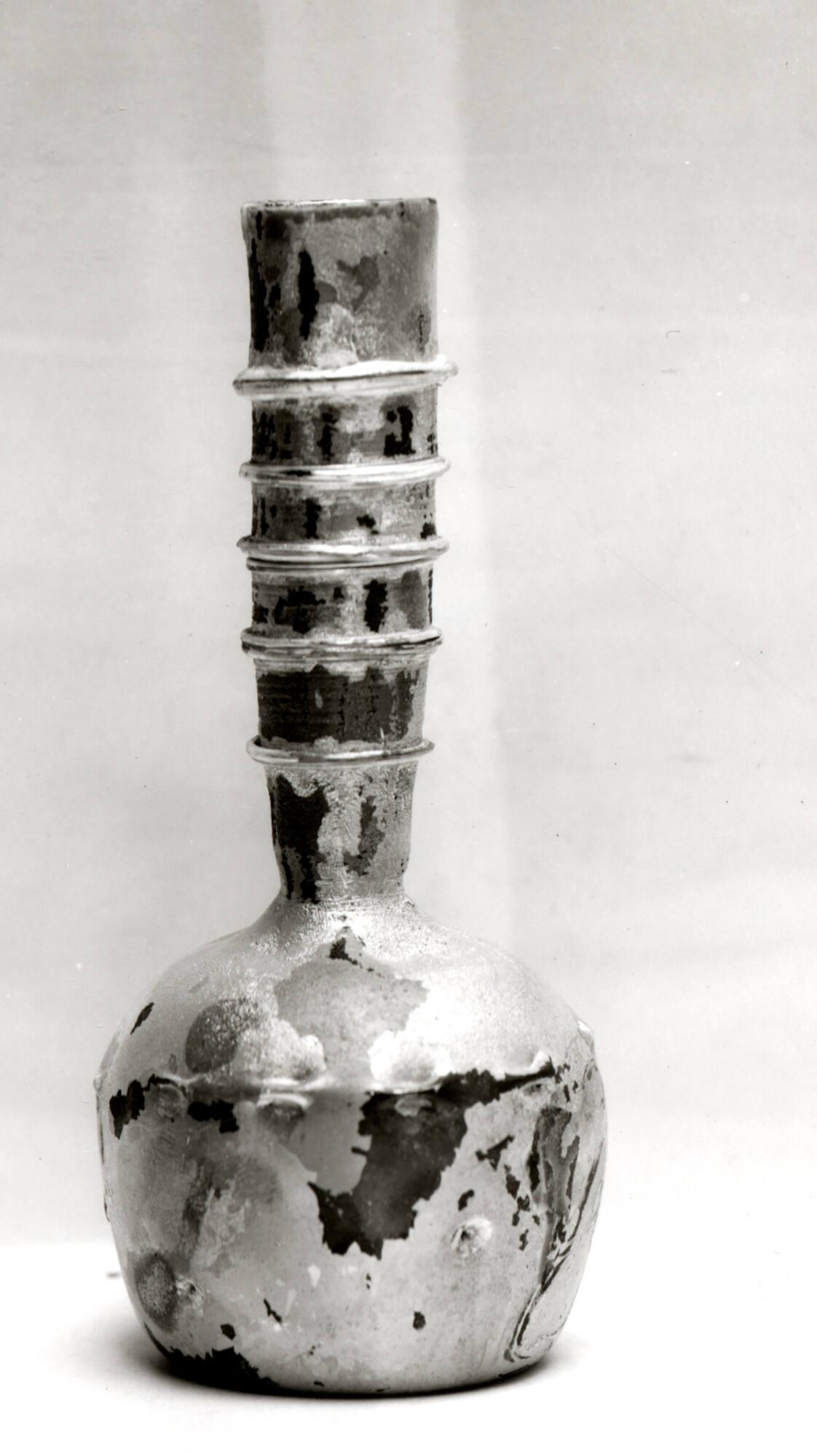 Rim rounded in flame. Tubular neck tapering downward with constriction at its base. Gently sloping shoulder. Bulbous body with greatest diameter below shoulder. Concave base.