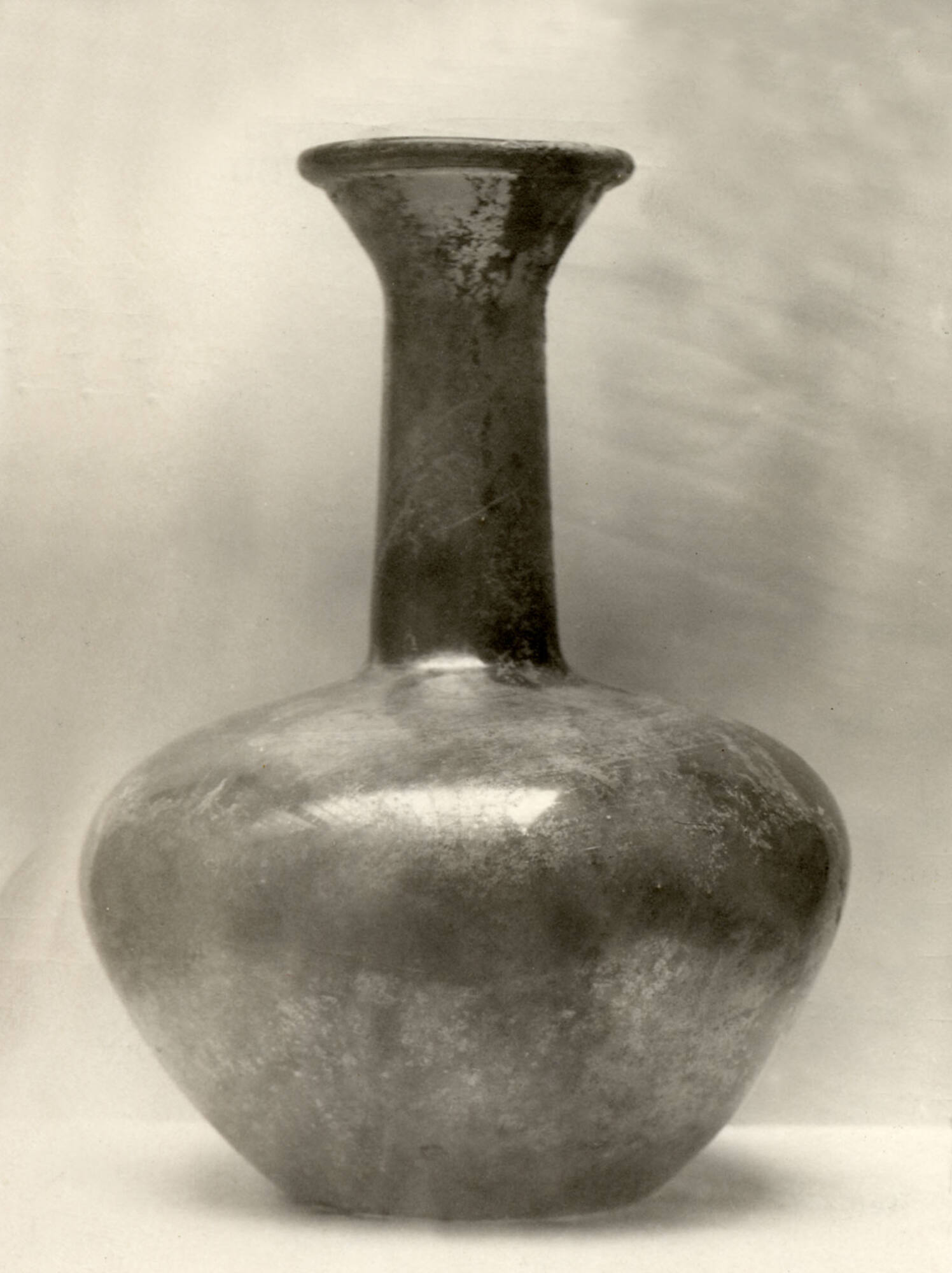 Label TextCore-formed and cast glass vessels had been made at least as early as the 15th century BCE in Egypt and Mesopotamia, but glassblowing did not appear in the Roman Empire until the first century BCE. This skill was brought to the capital city of Rome from the eastern Mediterranean (modern Syria), after the area was annexed by Rome in 64 BCE. Blown glass immediately became fashionable and the material of choice in every facet of daily life, from a lady’s dressing table to the dinner table. The three examples displayed here show the variety and sophistication of free-blown glass. Some of the best preserved glass was found in ancient tombs. The pointed amphora (bottle) may have contained perfume, the two-handled jar probably held oil, and the large bottle perhaps held wine—all ready to accompany the dead into the next life.about 4th century CE