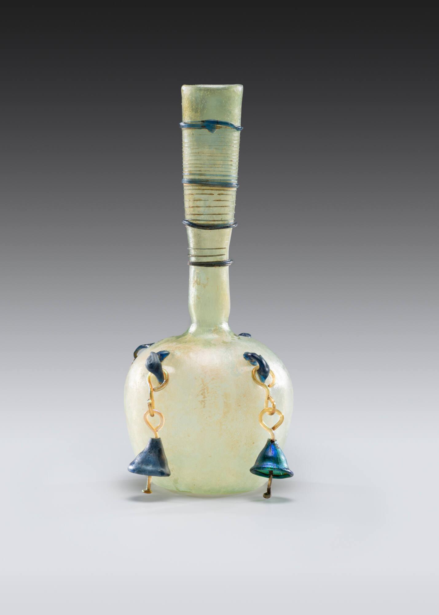 The bottle has a chimney mouth with a rim rounded in the flame. The tubular neck has a constriction at its base and connects to a bulbous body with its greatest diameter just below the shoulder. The base is concave. Around the middle three-quarters of the neck, there are at least thirty-two revolutions of a thin thread, with four separate coils applied at regular intervals from the top to the bottom of the thread decoration. On the shoulder of the body, four small loops of darker glass were applied, three of which still hold original decorative glass bells with clappers. Each bell is suspended by a simple colorless glass chain consisting of two figure-eight shaped glass links.