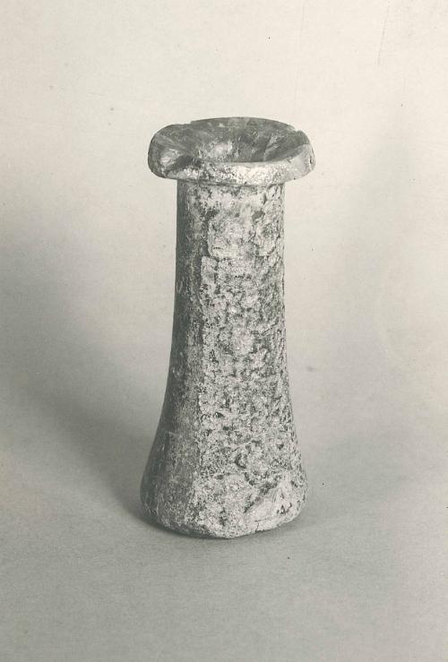 DescriptionThis vessel, categorized as a candlestick unguentarium (Class XIIID"2a), is made of translucent dusky green glass. It was free-blown and shaped using tools, with a wedge-shaped rim folded outward, upward, then inward. A clear tooling mark appears on the interior of the rim. The tall neck is concave and widens toward the flat base, with another tool mark about one-third of the way up. The vessel lacks a distinct body and has a circular scar, approximately 1.5 cm in diameter, on the base. Although glass fabric analysis is hampered by weathering, the thick walls are noted. Most known parallels have been found in Egypt, though specific dating evidence is scarce. A comparable example is listed in Auth 1976, no. 427.