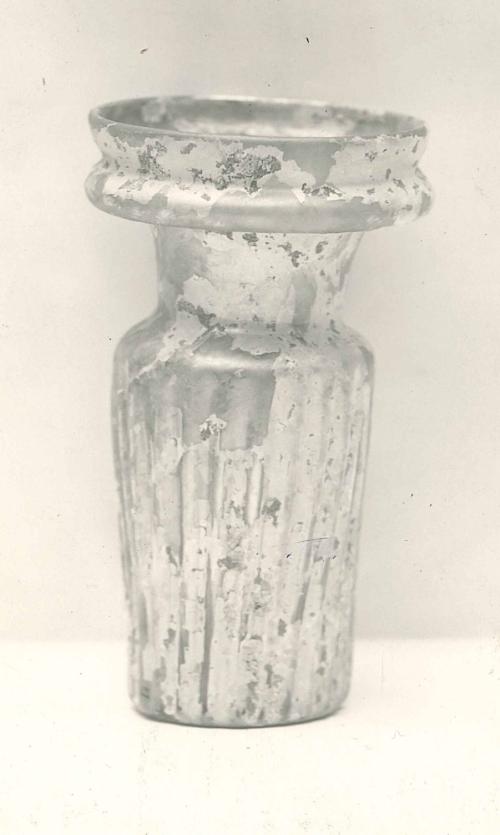 Body blown into a vertically grooved and ribbed pattern mold; the ribs can be felt on the interior. Neck and mouth free-blown. Cutout below rim. Circular scar on base ca. 1.8 cm.