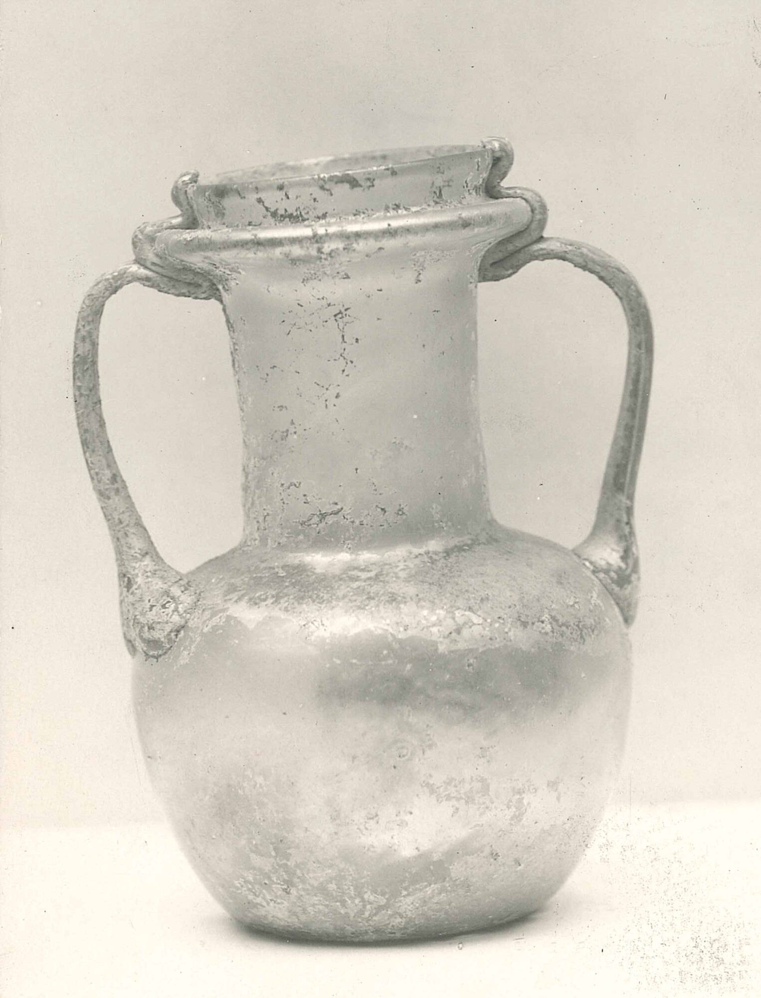 DescriptionThis vessel (Jar Class I C 1 a) is made of medium thin transparent pale green glass (10 G 6/2) with translucent handles and thread of a similar color. It was free-blown and tooled, with a pontil mark about 1.6 cm in diameter. The glass shows black specks in the thread and handles, and the fabric cannot be determined due to weathering. The rim is folded outward, upward, and inward. The neck is concave, transitioning into a sloping shoulder. The squat bulbous body has its greatest diameter at the midpoint. Two curved coil handles were applied from the shoulder to the rim, with one handle end clipped and the other folded back. A large zigzag thread decoration with fourteen segments runs from the shoulder to the base.