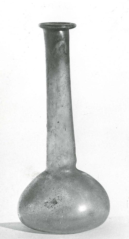 DescriptionThis vessel (Candlestick Class V2a) is made of transparent glass with a dusky yellow-green tint (5 GY 5/2). It is thin-walled and contains pinprick and small spherical bubbles in the body and vertically elongated bubbles in the neck. The form was shaped by free-blowing and tooling. The rim is horizontally outsplayed and folded inward. The neck is tall and cylindrical with a tool mark at its base. The small body is domed, and the base is flattened. There is no pontil mark.
