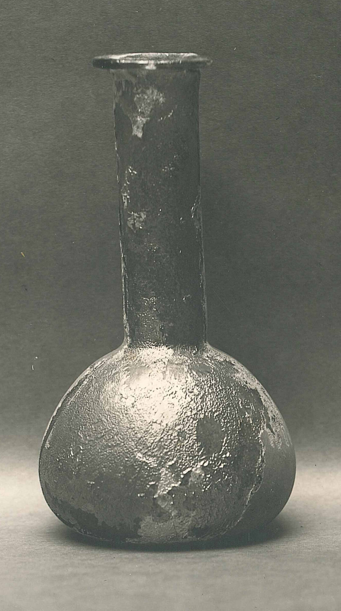 DescriptionThis flask is made of thin, transparent natural green glass (5 G 5/2). It was free-blown and tooled, with no pontil mark. The rim is outsplayed horizontally, folded inward, and flattened. The neck is tall, thick, and cylindrical, tapering slightly with a constriction at its base. The body is domed in shape and accounts for approximately half the vessel’s total height. The base is flat.