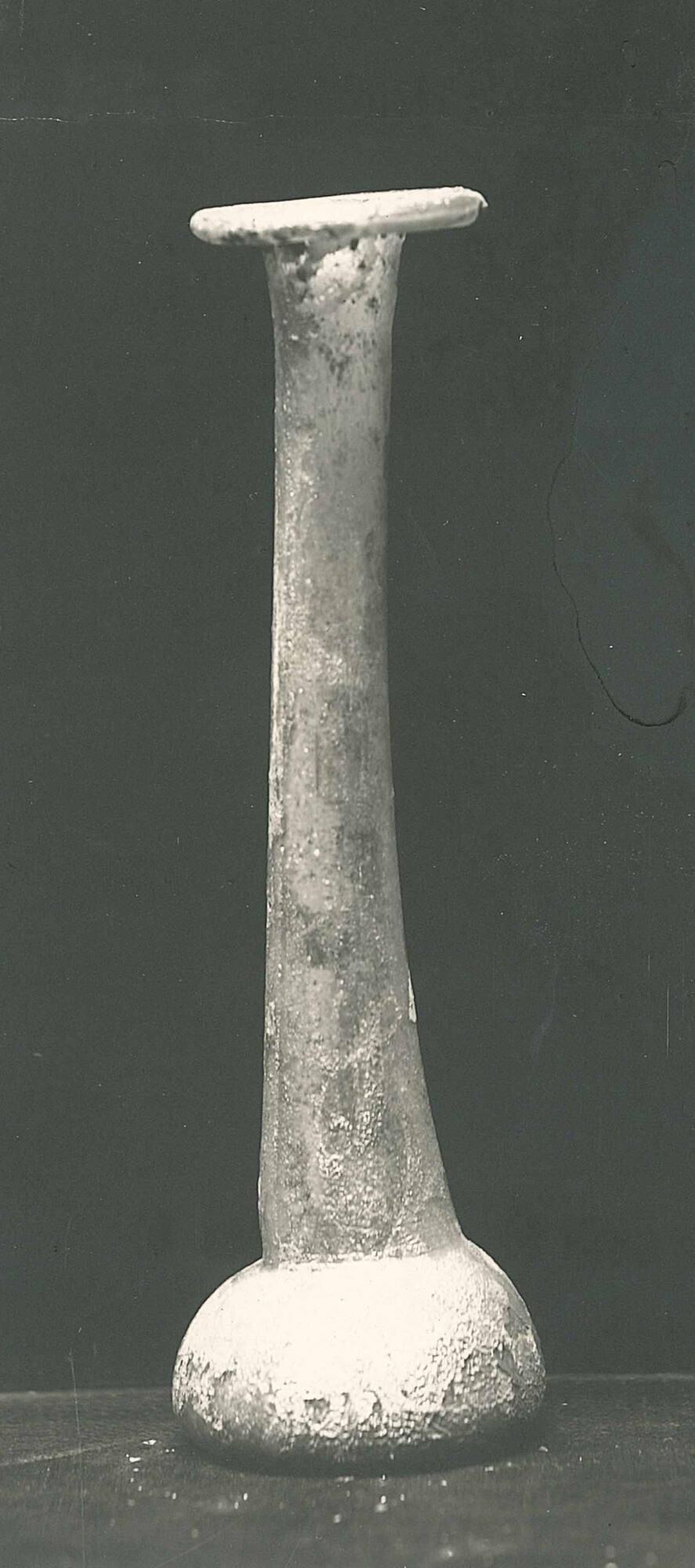 DescriptionThis flask is made of transparent natural pale green glass. The vessel was free-blown and tooled, and no pontil mark is present. The medium thin glass contains horizontally elongated bubbles in the body and vertically elongated bubbles in the neck. The broad rim is outsplayed horizontally, rolled inward, and flattened. The tall, slightly concave neck is crooked and shows a tool mark at its base. The small bulbous body comprises about one-seventh of the total height, with its greatest diameter at the bottom. The flat base includes a depression at the center.