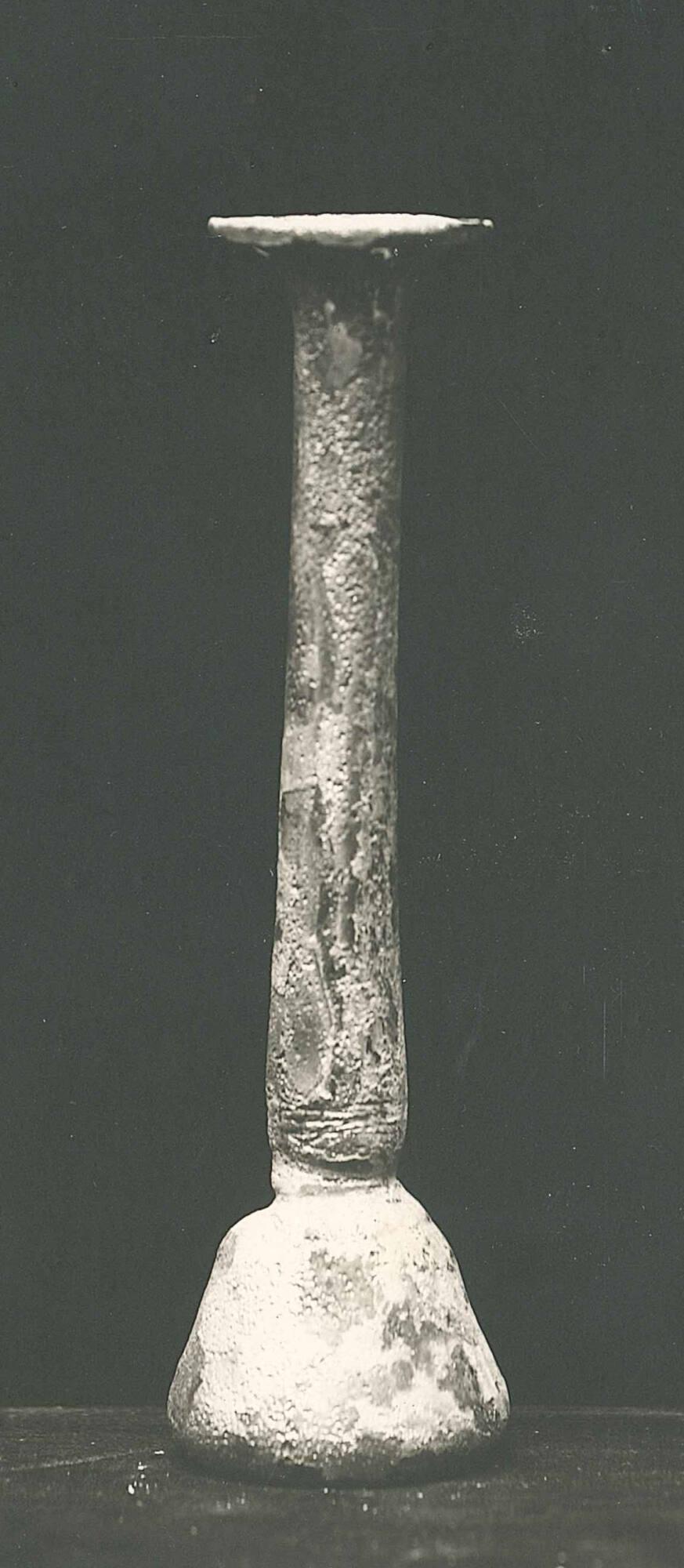DescriptionThis bell-shaped flask is made of transparent natural pale green glass. It was free-blown and tooled from medium thin glass and has no pontil mark. The rim is outsplayed at an angle and was presumably folded inward. The tall, thick neck tapers downward and is constricted at its junction with the body. The small bell-shaped body constitutes less than one-quarter of the vessel’s total height. The base is concave.