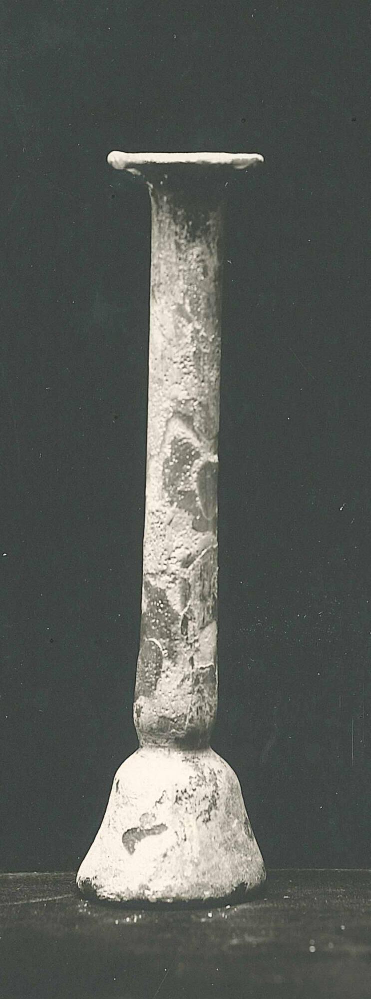 DescriptionThis vessel is made of thin, transparent natural pale green glass. It was shaped by free-blowing and tooling techniques, with no pontil mark. The outsplayed tubular rim is folded inward. The tall, slightly concave neck has a constriction at its base, transitioning to a small bell-shaped body that comprises about one-fifth of the vessel's height. The bottom is concave.