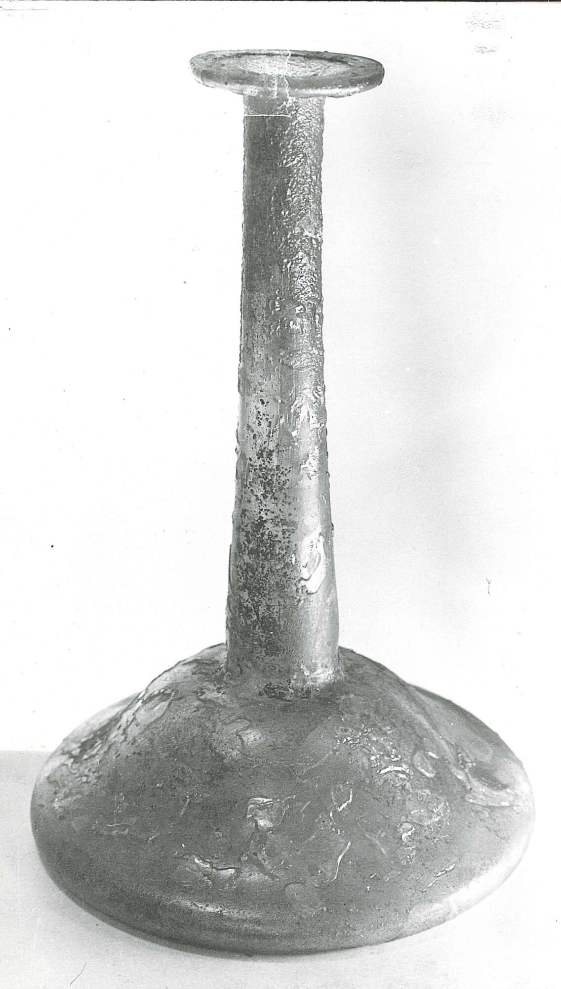 DescriptionThis vessel is made from transparent, decolored glass with a yellowish gray tinge (5 Y 7/2). It is free-blown and shows no evidence of a pontil mark. The narrow hollow rim is outsplayed horizontally, rolled inward, and flattened to form a broad brim. The tall neck tapers downward and ends in a constriction at the junction with the body. The flat, bell-shaped body accounts for less than one-fifth of the vessel’s total height, with its walls curving in an elongated “S” profile. The base is concave. The object is classified as Candlestick Class VIIB1a, a type that resembles a candlestick in shape and has few close parallels, though one example is known from Cyprus.