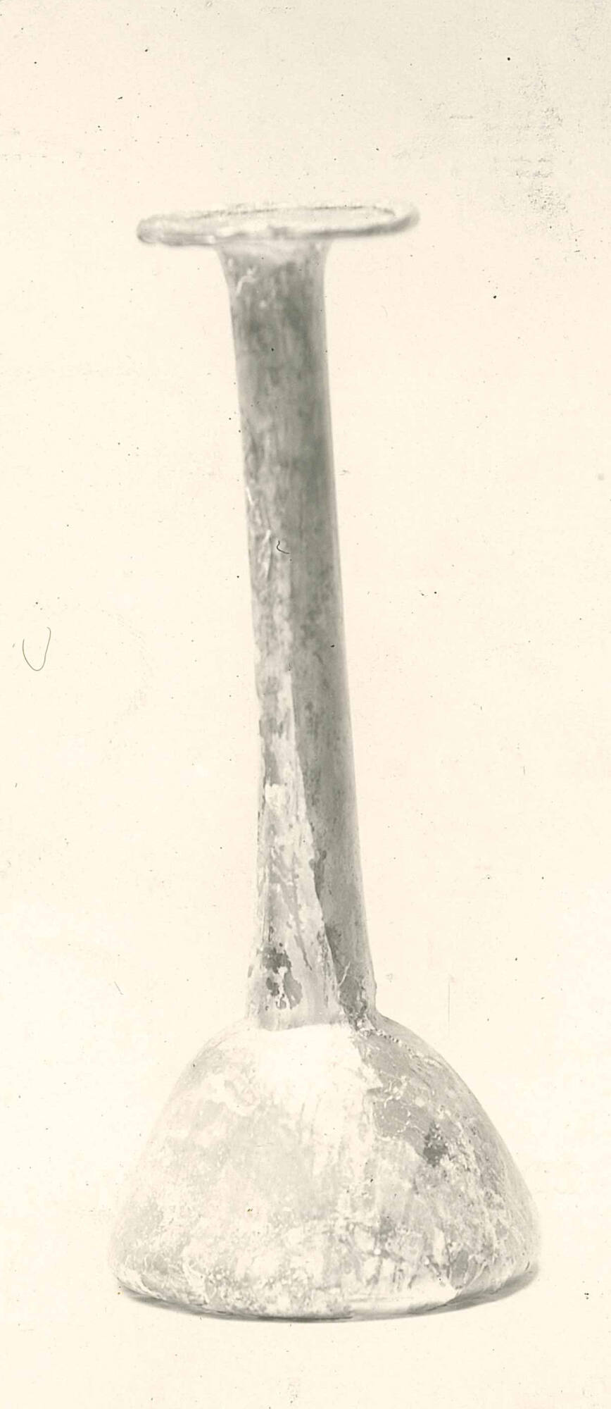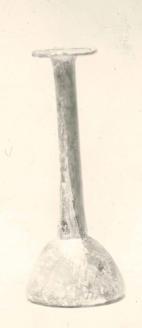 DescriptionThis vessel is made of transparent natural pale green glass and formed of thin fabric. It was free-blown and tooled, and shows no evidence of a pontil mark. The broad hollow rim is outsplayed horizontally, folded inward, and roughly flattened. The tall cylindrical neck features a tooling mark at its base. The bell-shaped body accounts for about one-quarter of the vessel’s total height. The base is flat and recessed.