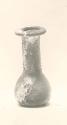DescriptionSquat bottle with piriform body, classified as a candlestick unguentarium (Candlestick XIID"3a). Made of medium thin transparent natural green glass, though the exact color and fabric cannot be determined due to weathering. Free-blown and tooled, with a circular scar on the base measuring about 1.9 cm. The rim is outsplayed horizontally, folded inward, and flattened. The tall cylindrical neck curves smoothly into the shoulder, leading to a pear-shaped body and a flattened base with a slight central depression.