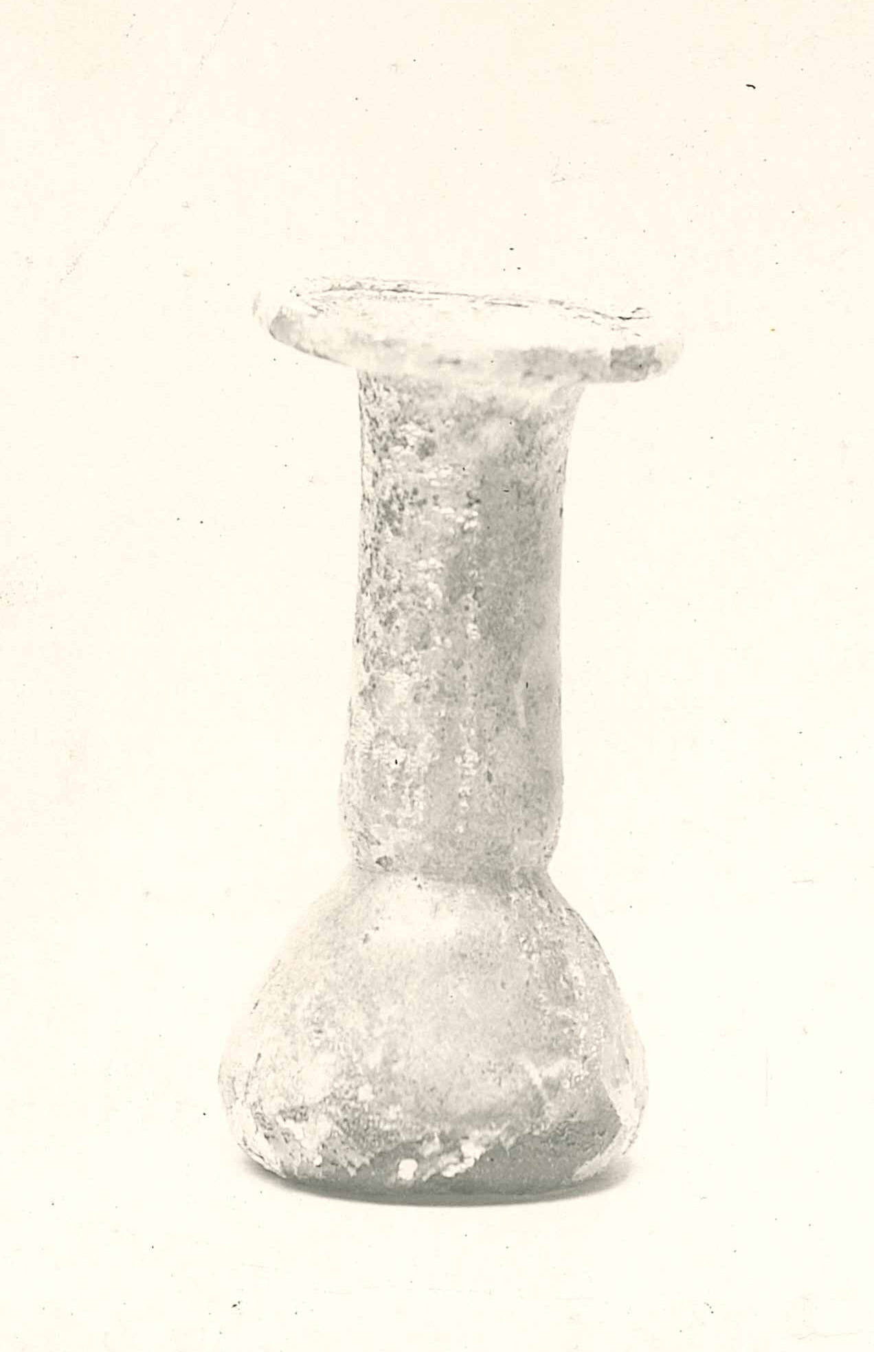 DescriptionConical flask classified as a candlestick unguentarium (Class XD"2a). Made of medium thin, transparent to translucent pale green glass. Free-blown and tooled, with a circular pontil scar on the bottom measuring approximately 1.8 cm in diameter—an uncommon feature for Palestinian examples. The rim is outsplayed horizontally and folded inward. The tall cylindrical neck shows a toolmark and slight constriction at its base, transitioning to a squat, conical body that makes up about one-third of the vessel’s total height. The base is flat with a central depression.