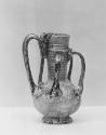 The rim is rounded in flame. The neck is funnel-shaped with a sloping shoulder and a bulbous body that has its greatest diameter just below the middle. The pushed-in base forms a hollow base ring. Five curved coil handles are applied to the shoulder; four small handles are attached over threads around the neck about 2.6 cm below the rim where they are folded upward along the neck. The fifth handle is larger and attached to the edge of the rim where it is folded downward and upward to form an open loop.