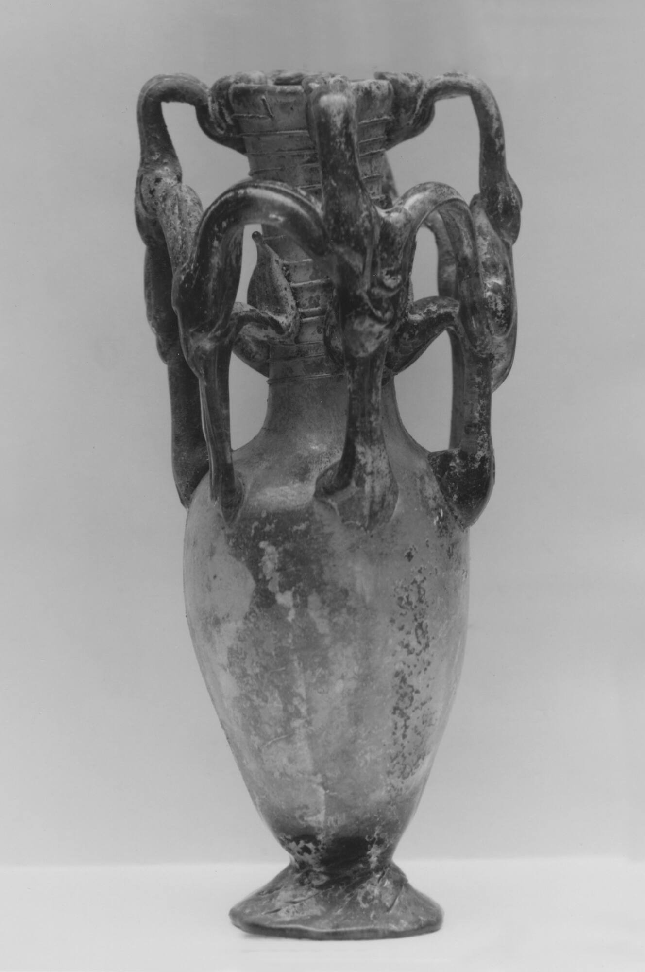 DescriptionThis multiple-handled bulbous bottle is free-blown from translucent, rather heavy greenish glass that is medium thick, with numerous small and medium-sized ovoid and vertically elongated bubbles and some large bubbles in the lower body. The glass is transparent natural yellowish green (between 10 GY 4/4 and 10 GY 5/2), with similarly colored translucent handles, thread, and pad base. The pontil mark is about 2.2 cm in diameter, with added thread and excess glass at the tips of the handles clipped off. The rim is rounded and thickened in flame with a tool mark on the interior, and the tall tubular neck rises from a gently sloping shoulder above an elongated pear-shaped body that is contracted toward the bottom and stands on a low flaring pad foot. The pad base shows slanting tool marks on the interior and exterior. Six angular coil handles are applied to the shoulder and attached to the lower part of the neck, arcaded with six separate coils to make a second tier, which is topped by four angular coil side handles attached below the rim and folded downward, inward, and upward to form a closed loop, then bent inward over the rim and flattened. Around the neck from above the shoulder to the rim are fourteen revolutions of thread trailed upward from left to right. This vessel is classified as a Multiple-handled Bottle Class VG3b.