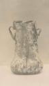 DescriptionThis double tube is made of thin glass in a transparent natural pale green hue (10 G 6/2). The handles and thread are translucent in a similar color. Blowing spirals are visible, but the fabric cannot be determined because of weathering. A pontil mark approximately 1.7 cm in diameter is present. The body was shaped by free-blowing and tooling, including an added thread and handles. The vessel was pinched once lengthwise and reblown. Excess glass at the tips of the handles was folded back against the left handle and snapped off on the right side.