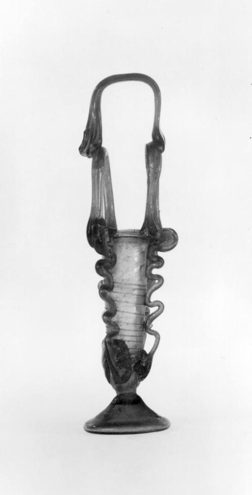 DescriptionThis free-blown and tooled tube-shaped vessel is made of medium thin glass in a transparent natural grayish-green color (near 10 GY 5/2, but more yellow). The body contains some pinprick and oval bubbles in the upper section and vertically elongated bubbles in the lower section. A pontil mark about 1.5 cm wide is visible on the base. Thread decoration and handles were added separately, with excess glass at the tips drawn back against the handles.